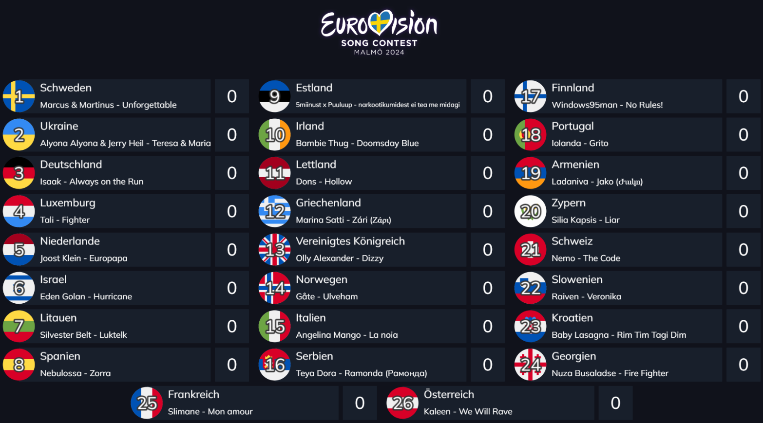 Voting von 1 bis 5 Punkte in den Kategorien Song, Performance und Bühnenshow pro Auftritt.